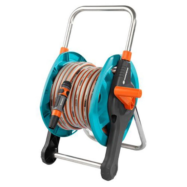 This hose reel set features a special folding mechanism for space-saving storage and a swivel axle to prevent the hose from kinking