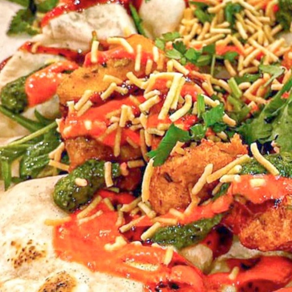 Small plates available include: yoghurt shots - crisp shells filled with various chutneys, yoghurt, chickpea, onions and potato | pakora pops - crunchy spinach, potato and onions with a dipping sauce | chicken tikka or paneer roti roll | crispy, spiced chicken bites with fresh coriander chutney, topped with Bombay sprinkle