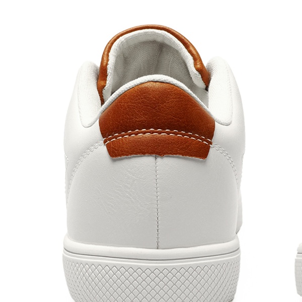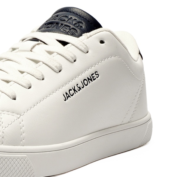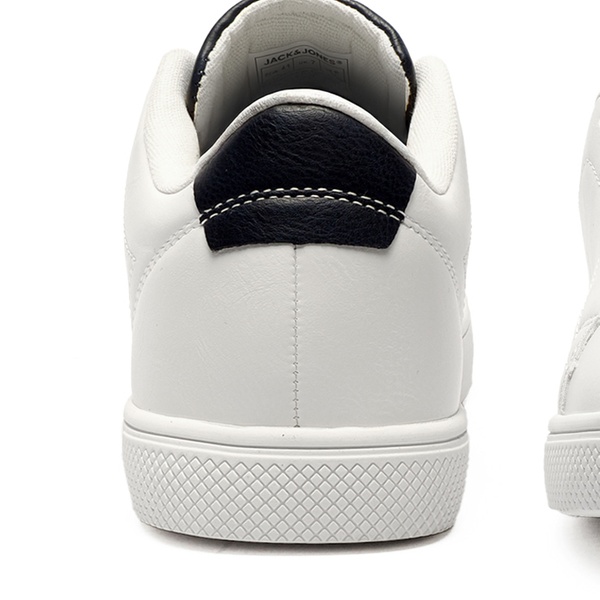 - Crisp white upper with contrasting navy accents on tongue and heel