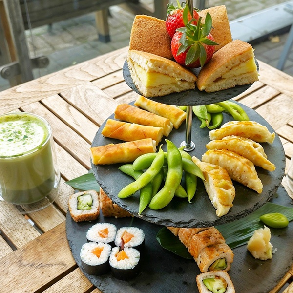 British Tradition meets Tokyo! This delicious take on a classic afternoon tea features fresh sushi, crispy gyozas, crunchy spring rolls and sweet dorayaki pancakes.