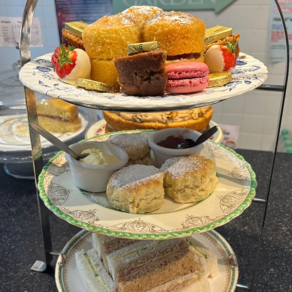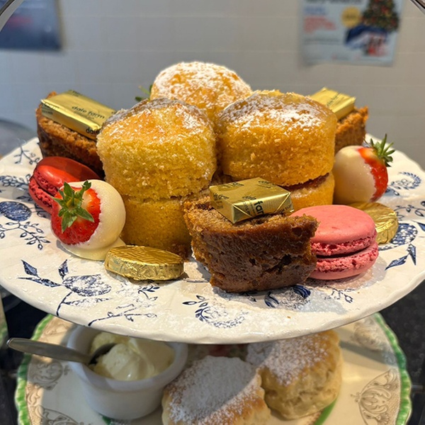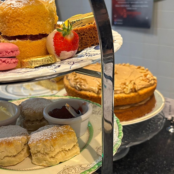 • Cakes & Pastries: A tiered plate of assorted homemade small cakes and sweet treats e.g., Victoria sponge, chocolate cake, seasonal special Toasted tea-cake