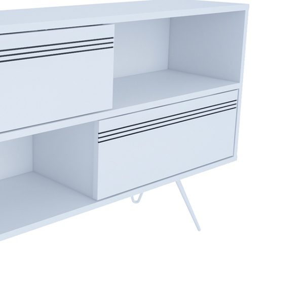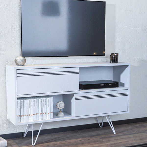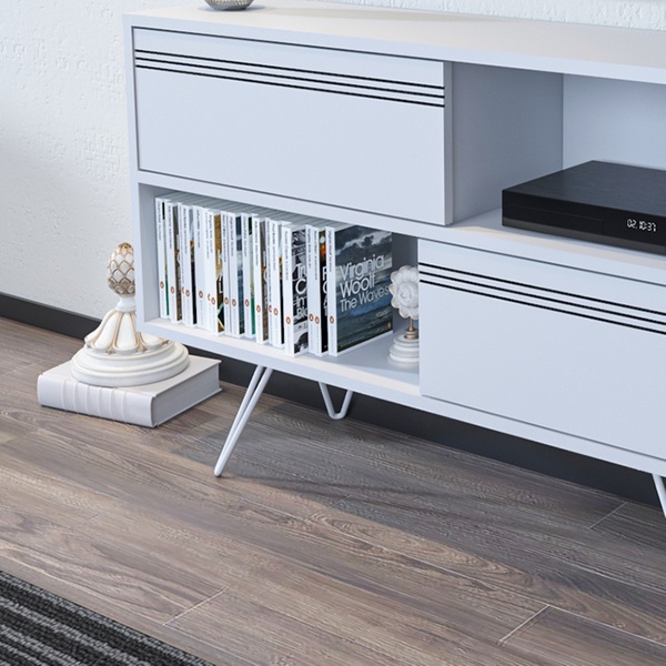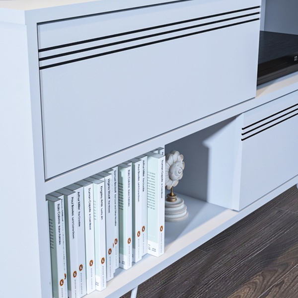 - Featuring two half-open shelves and two cabinets, the media stand offers ample storage space
