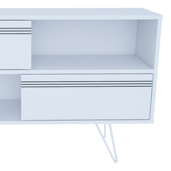 Designed with two half-open shelves and sleek drop-down doors, this TV stand maximizes storage while enhancing modern decor