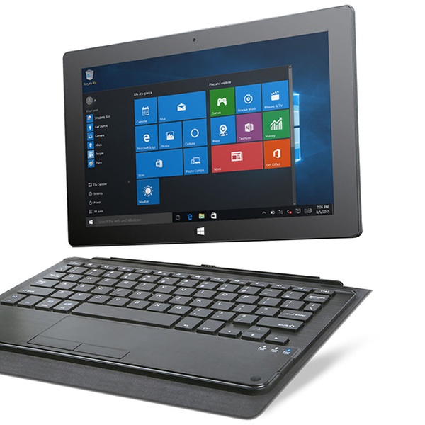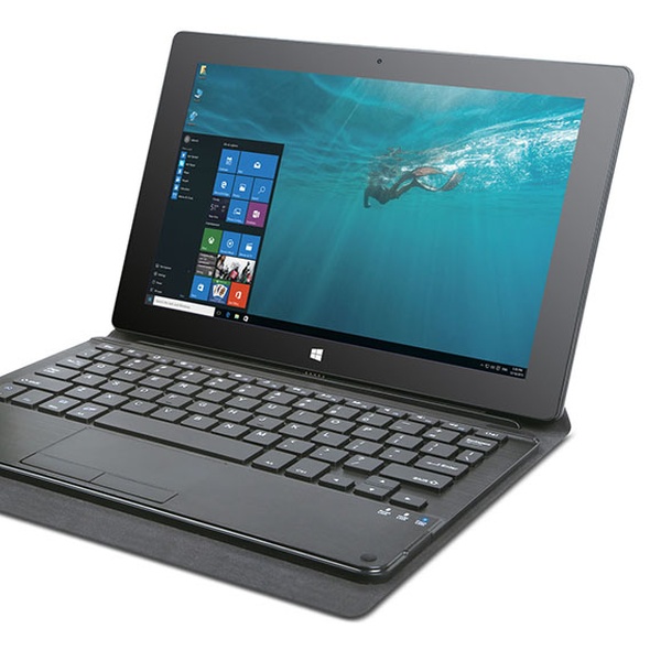 This hybrid PC functions as a tablet and a laptop; complete with a touchscreen for convenient navigation and a fully functional keyboard