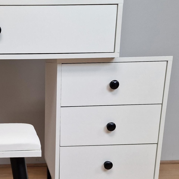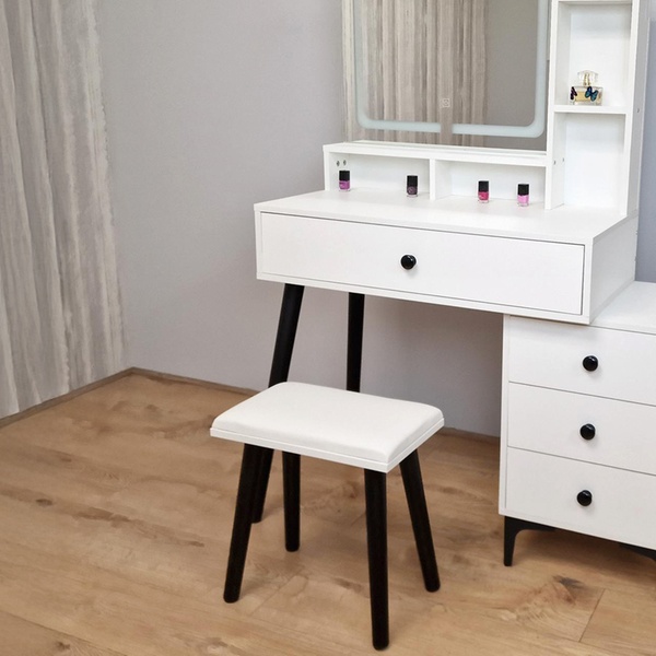 The dressing table comes with one large drawer and three medium-sized drawers and multiple shelves for providing dedicated storage for cosmetics, magazines, and jewellery.