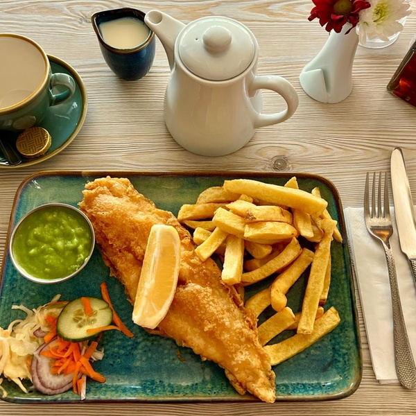 Indulge in a smile-worthy meal featuring fresh Haddock, crispy chips, and a hot beverage, all infused with classic tastes and served in a tranquil lake-view setting