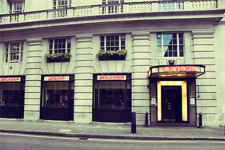 Langan's Brasserie is in Mayfair, just north of Piccadilly and a few steps from Green Park and its eponymous underground station. It can be easily recognised on stately Stratton Street by its retro-chic neon signs outside.