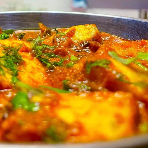 Mushroom Tikka Masala – Tandoori-grilled tofu tikka simmered in a rich tomato, onion, and ginger-garlic masala sauce.