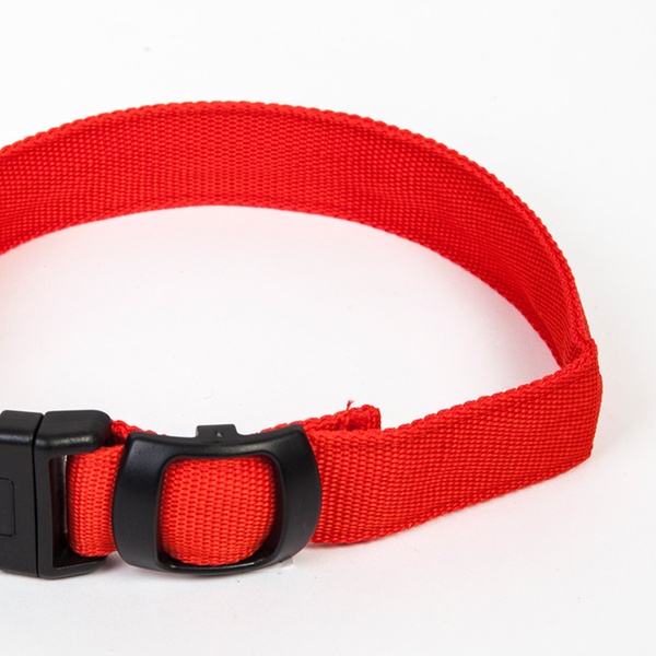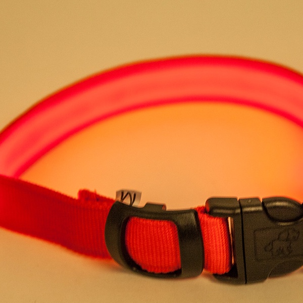 Adjustable dog collars with LEDs, D-ring for a leash and an easy clip release; light settings vary from static to fast flash