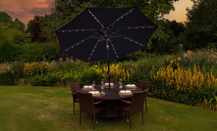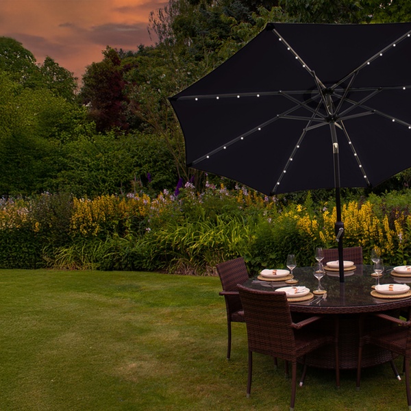 Today's Groupon offers LED Parasol 2.7m Tilt Design, Black with 32 Solar-Powered Lights, distributed by Monster Group.