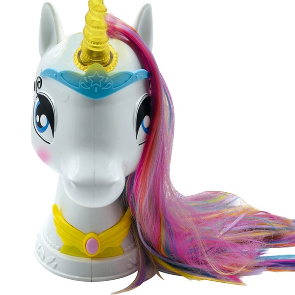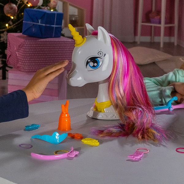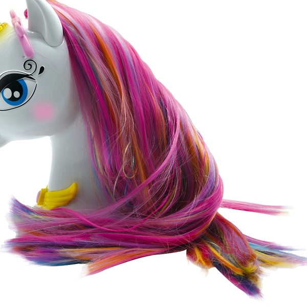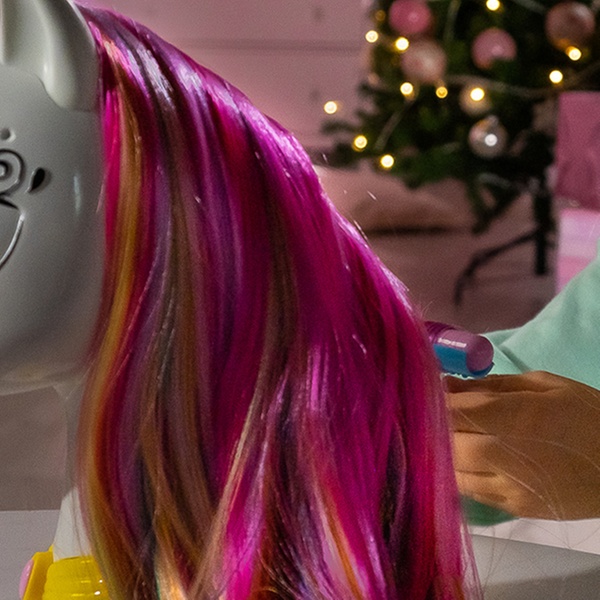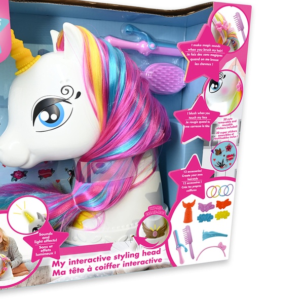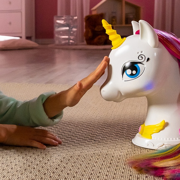 This interactive unicorn toy features long silky hair, blushes when happy, lights up when petted, and plays music when its hair is brushed; ideal for children 3 years and older