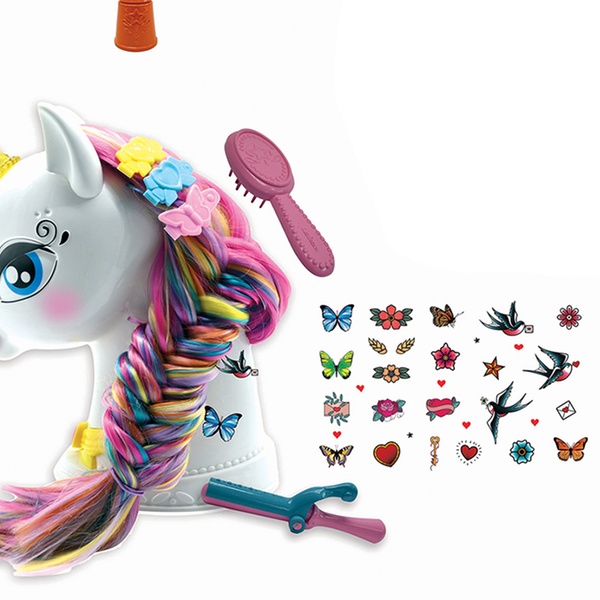 Includes a variety of accessories such as barrettes, tiara, glitter powder, rubber band, headband, and curling iron