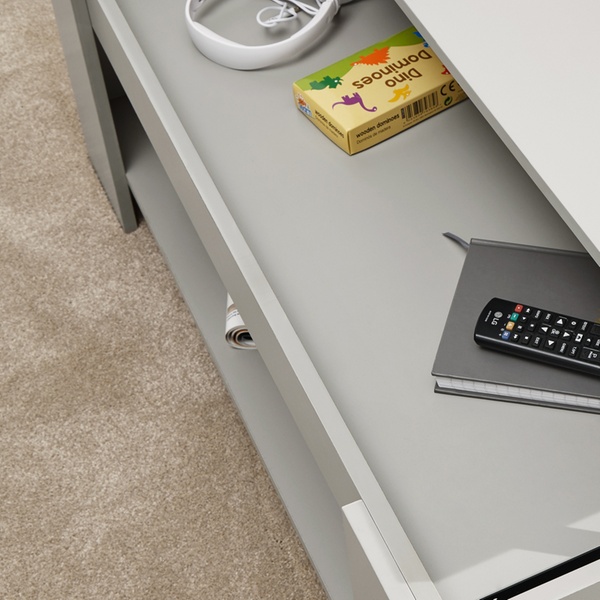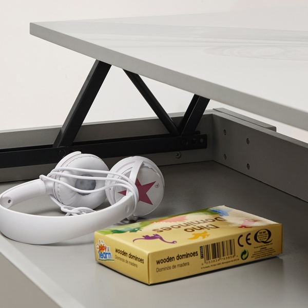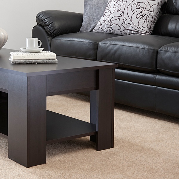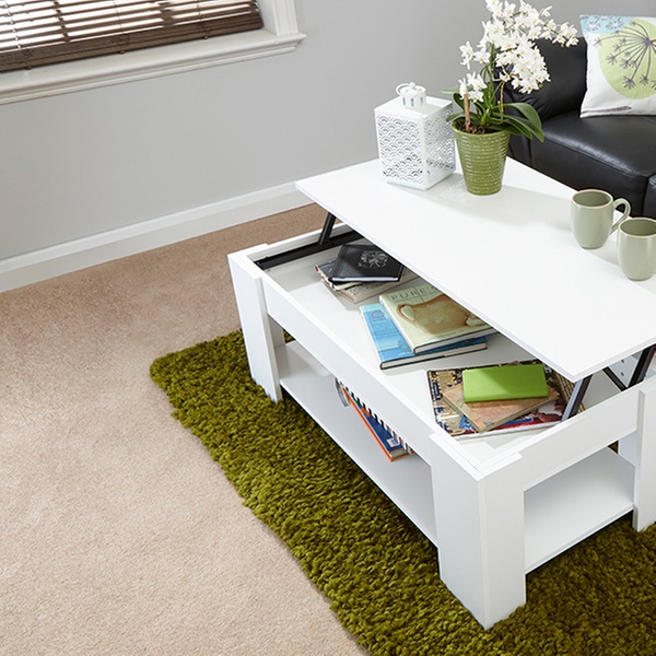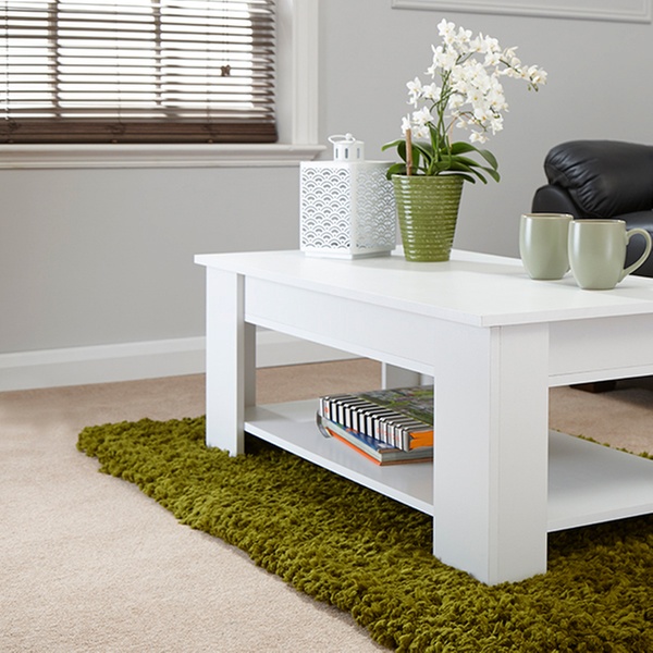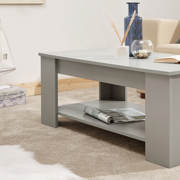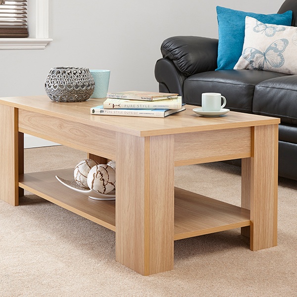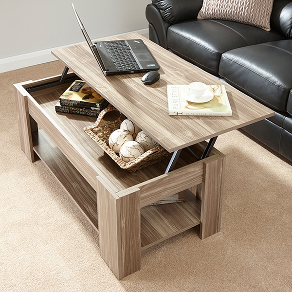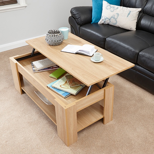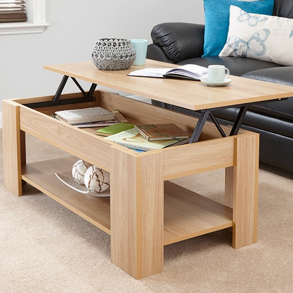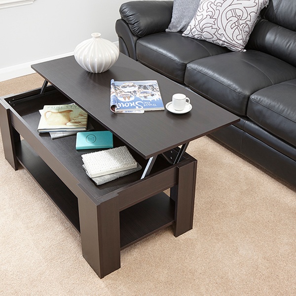 Ideal for office or home use, this modern coffee table features a mechanical lifting tabletop and an additional bottom shelf