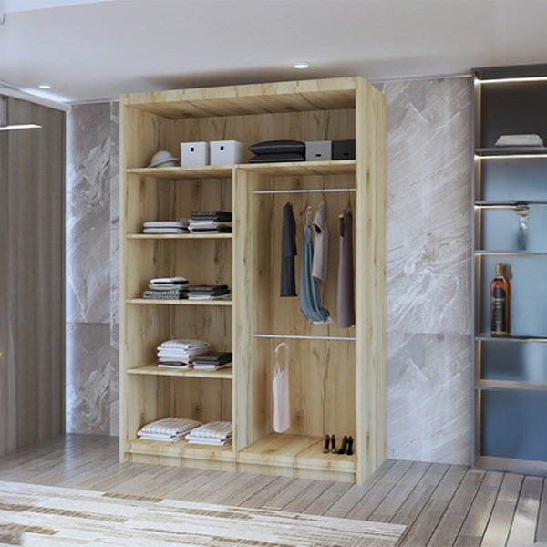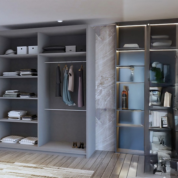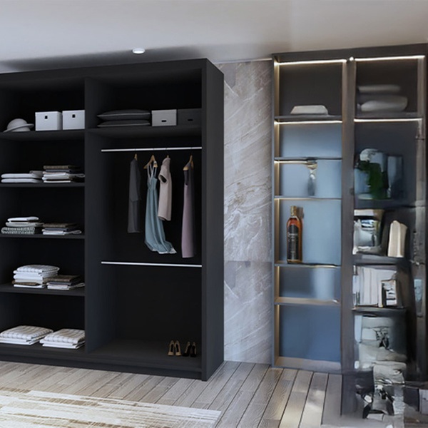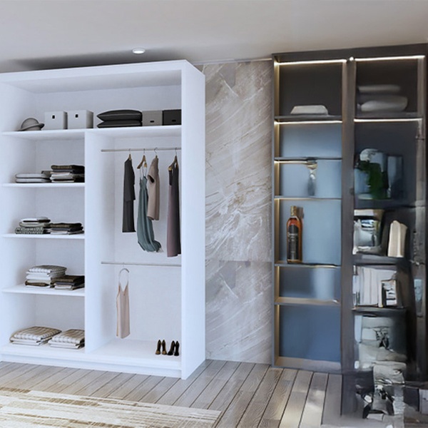 • Adjustable shelves and hanging rails to create a custom layout that fits wardrobe needs.