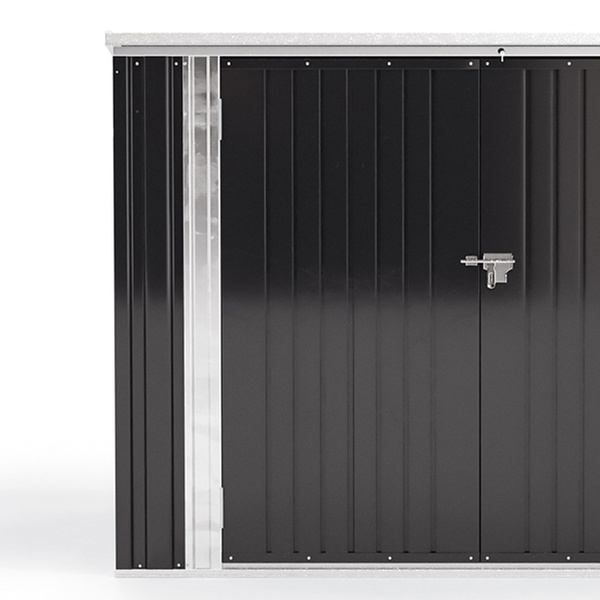 Sleek charcoal black steel design meets ample outdoor storage; ideal for keeping trash and recycling neatly tucked away