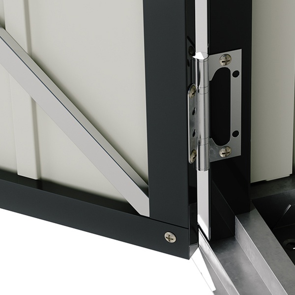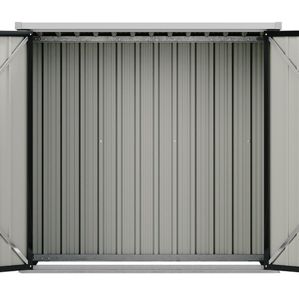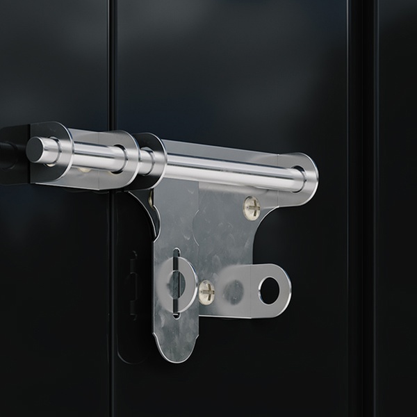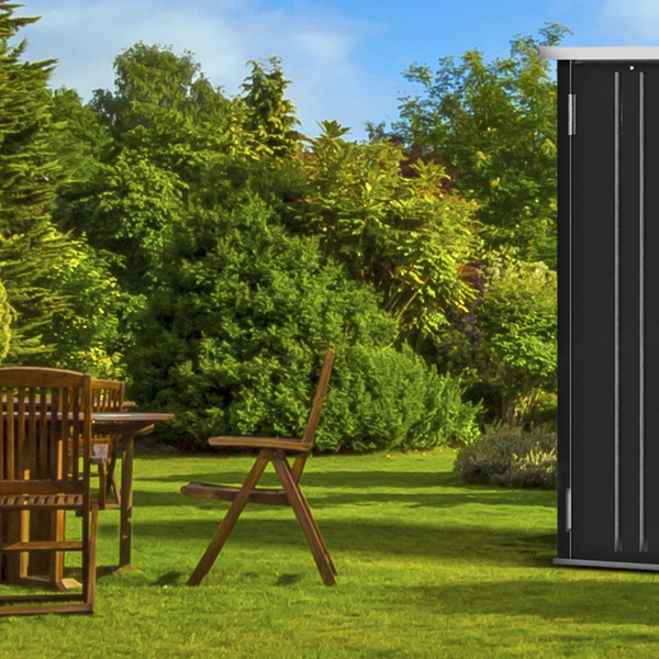 Effortlessly stylish and practical, this lockable metal storage shed features a sloped roof design for optimal rainwater runoff
