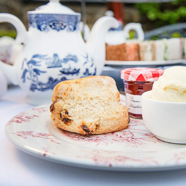 - Freshly-baked scones with Devonshire clotted cream and strawberry preserve