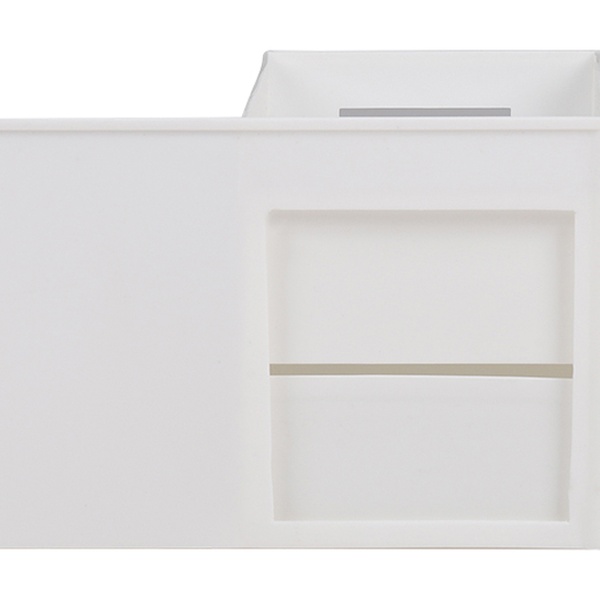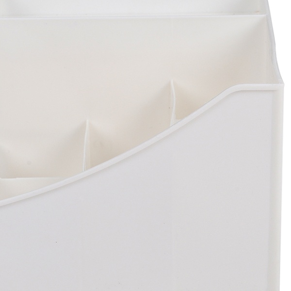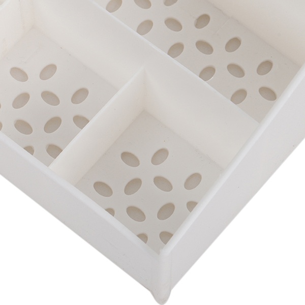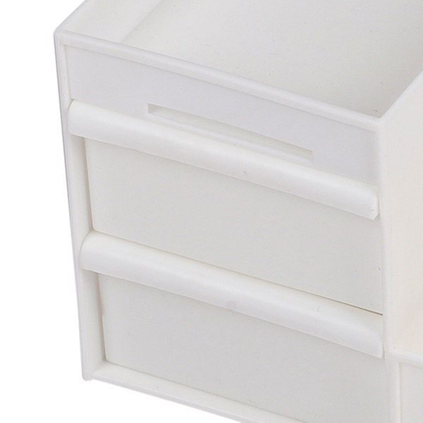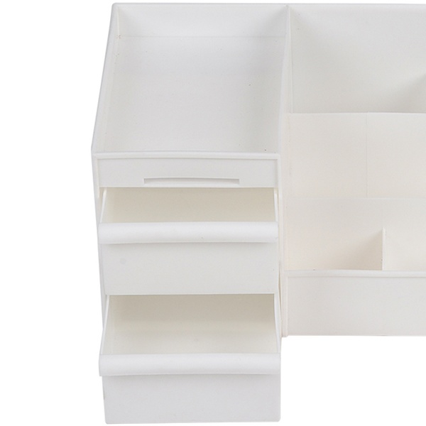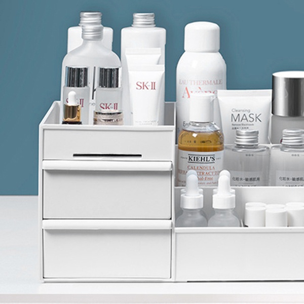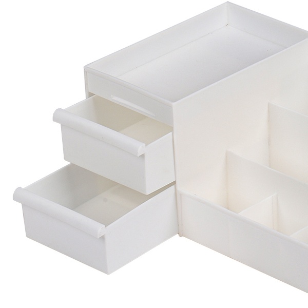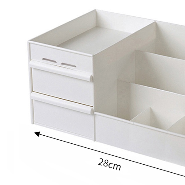 Tidy up the vanity with a sleek plastic storage box featuring multiple compartments and drawers for effortless makeup organisation