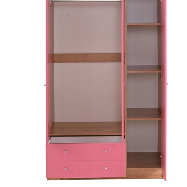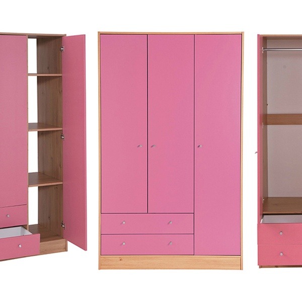 This three-piece set with wood effect comes with a spacious wardrobe, chest of drawers and bedside chest in pink and requires self assembly