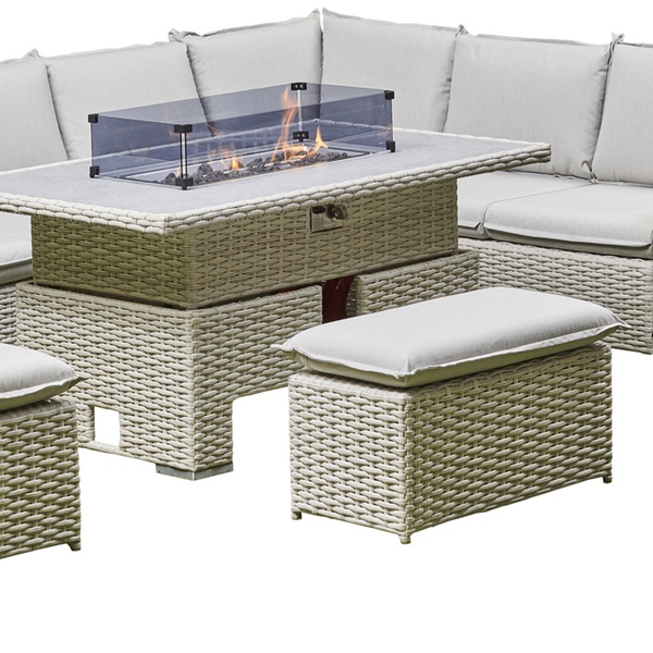 - Features a rising dining firepit table that transforms easily between a coffee table and a dining-height surface