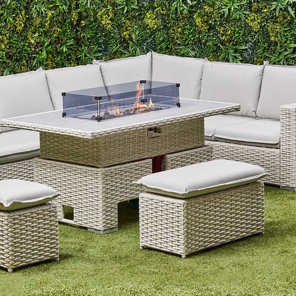 - Fire pit table dimensions: (L)150cm x (W)90cm x height adjustable between 48cm and 74cm