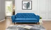 A practical velvet sofa bed featuring elegant button tufting, soft upholstery, and sleek black and gold legs, designed to transition effortlessly from a stylish sofa to a comfortable sleeping space