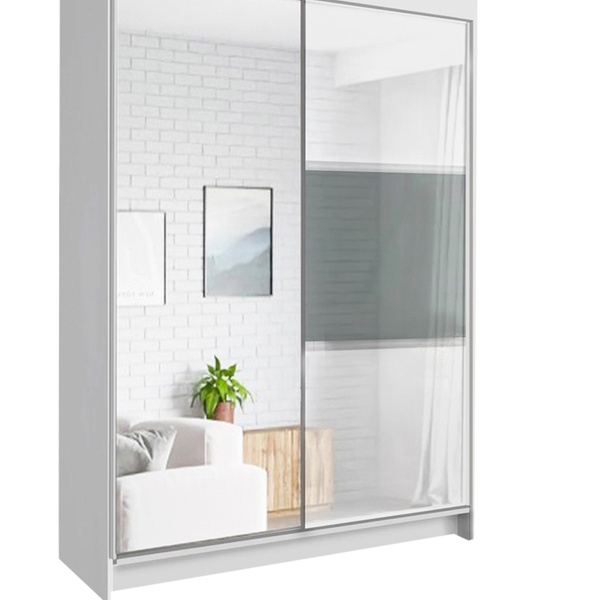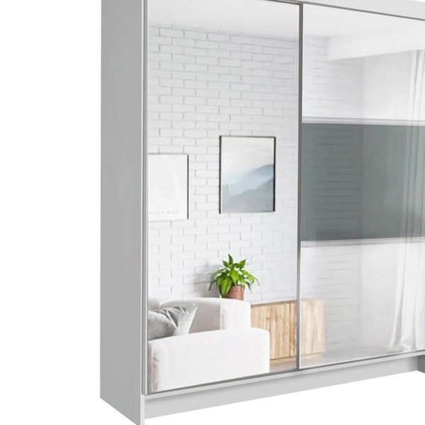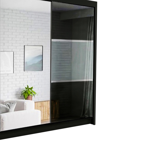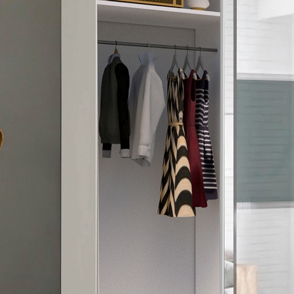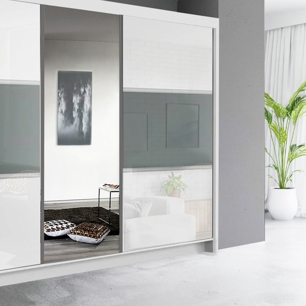 Featuring multiple shelves, hanging rails and drawers, this sliding-door wardrobe can add a touch of modern style to your bedroom