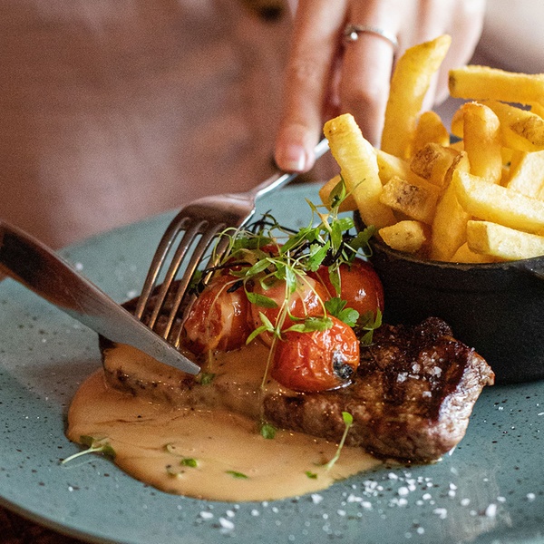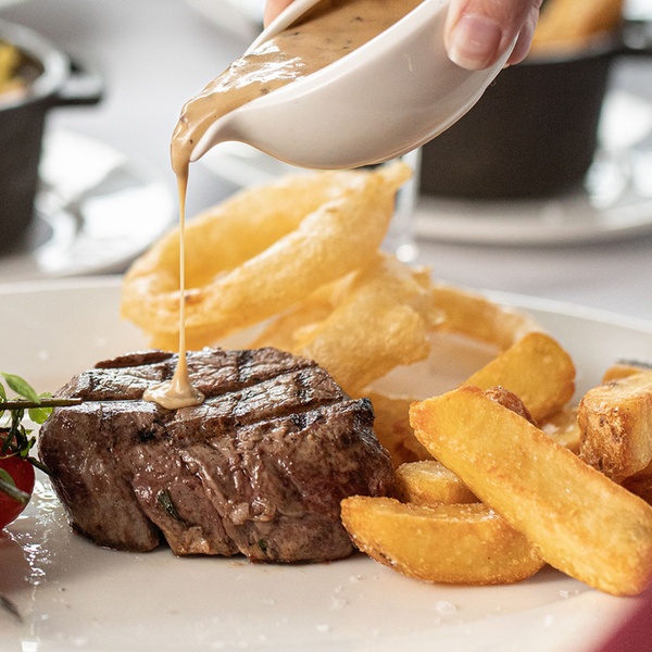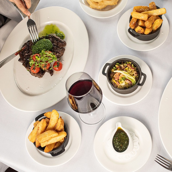 Enjoy dinner for two with a classic grilled rump cut of meat, chunky chips, choice of sauce, and two glasses of house red wine!