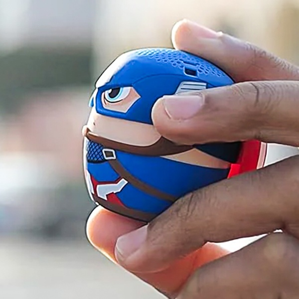 This mini Bluetooth speaker boasts a compact design, delivering powerful sound in a portable package and featuring a playful Captain America theme.