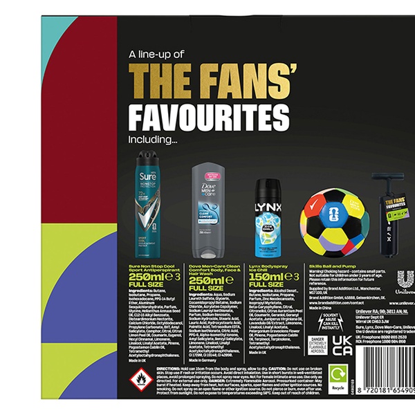 - Includes Lynx Ice Chill Bodyspray, Dove Men+Care Clean Comfort Body Wash, Sure Nonstop Cool Sport Anti-Perspirant, skill ball & pump