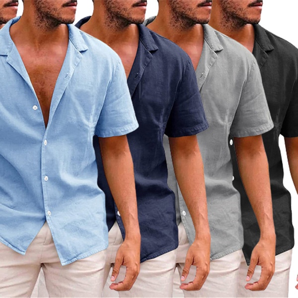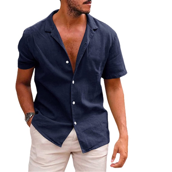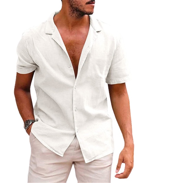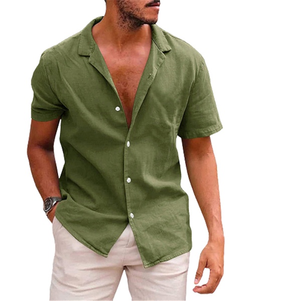 Today's Groupon offers Men's Short Sleeve Cuban Collar Button Down Summer Tops, distributed by Longtoo Limited.