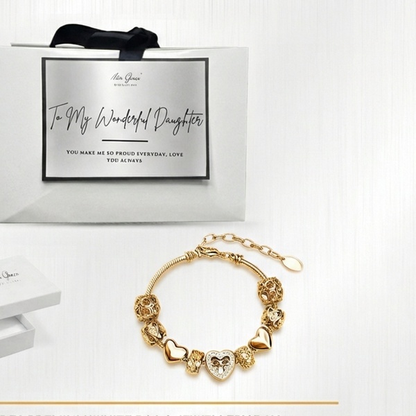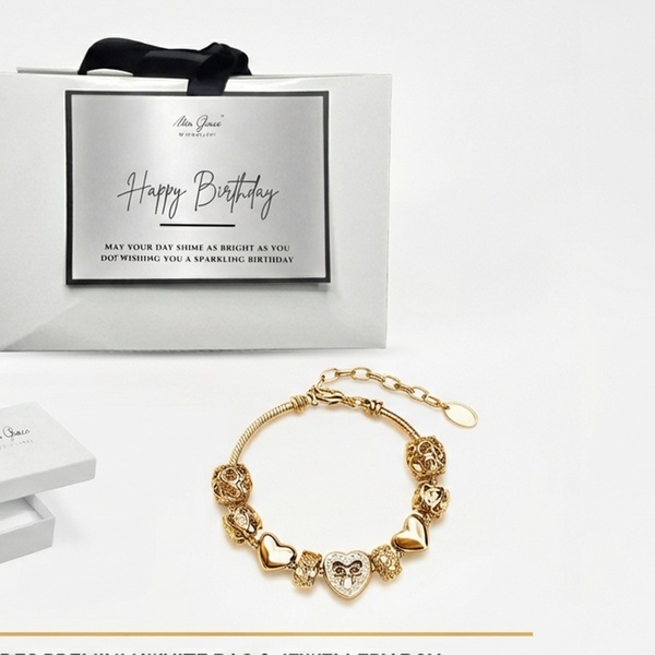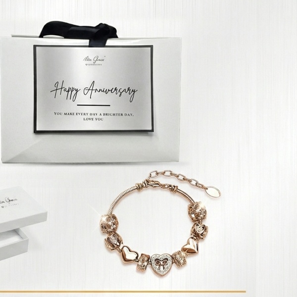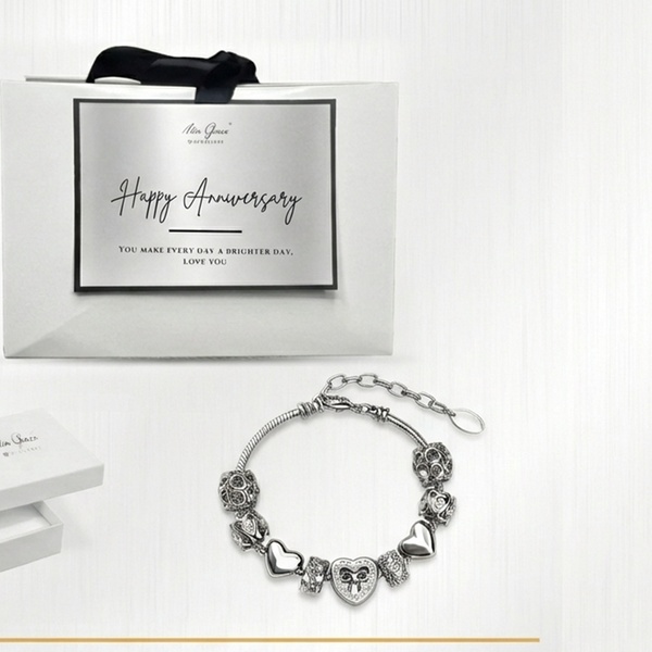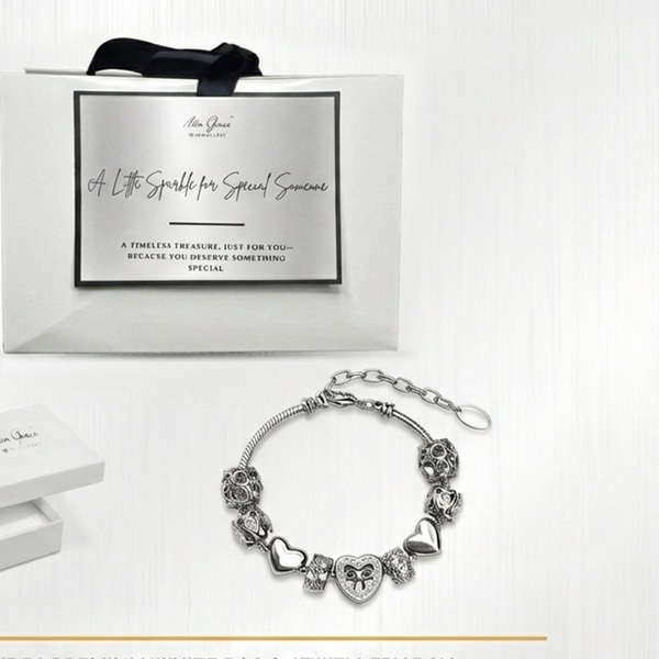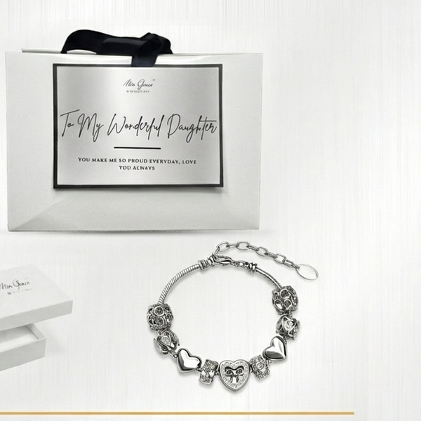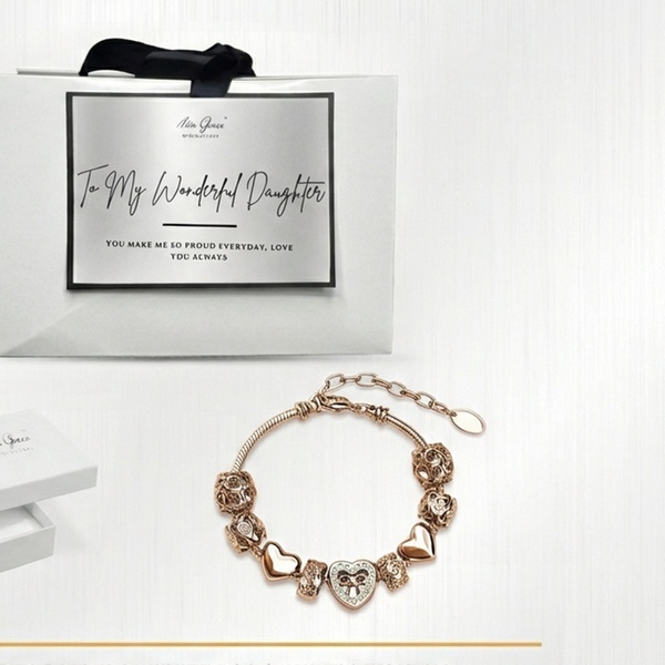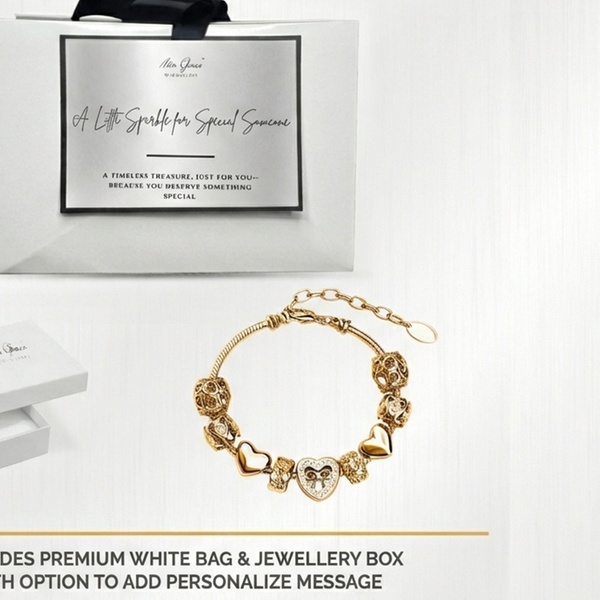 his exquisite piece features nine intricately designed charms, including filigree beads and a centerpiece crystal-adorned heart with a bow