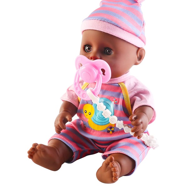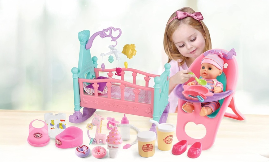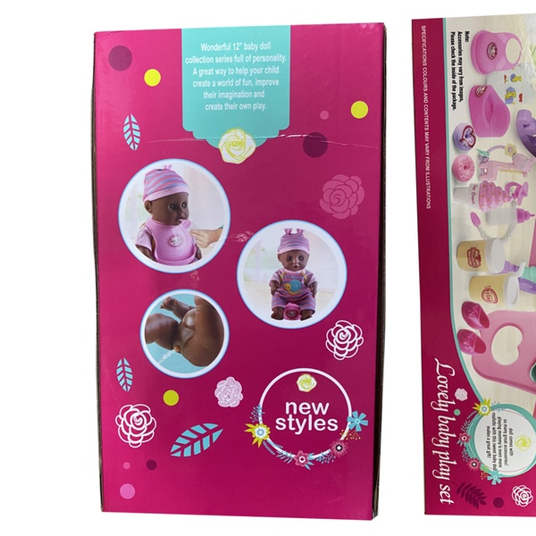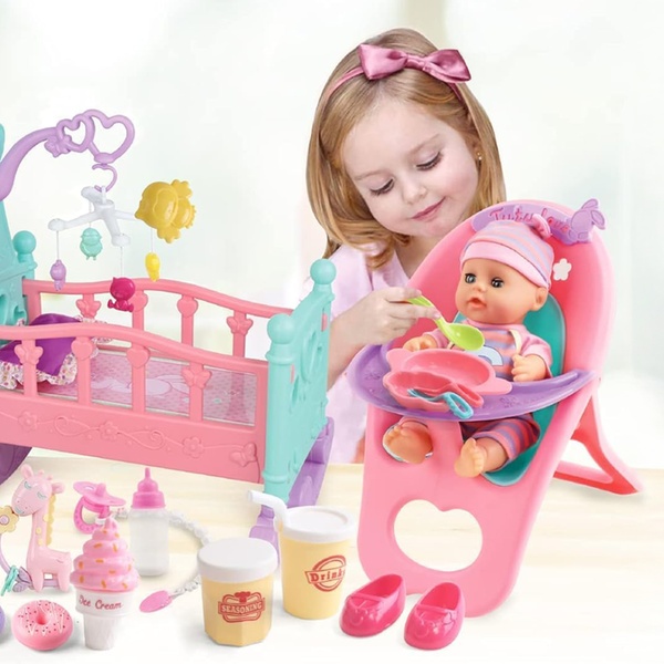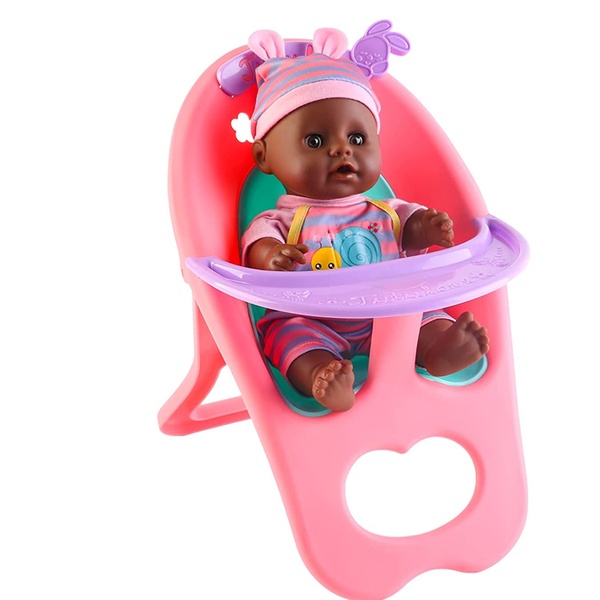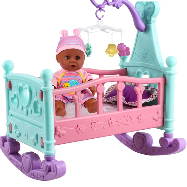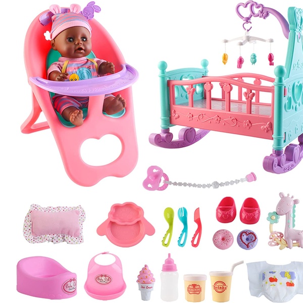 - Set includes a black soft doll, cradle cot, highchair, potty, nappy, pacifier, bottle, feeding bowl, and toy fork and spoon