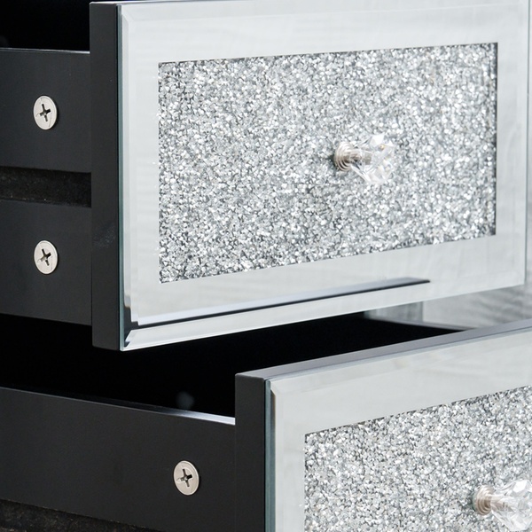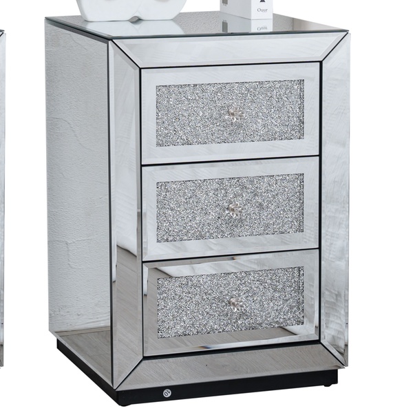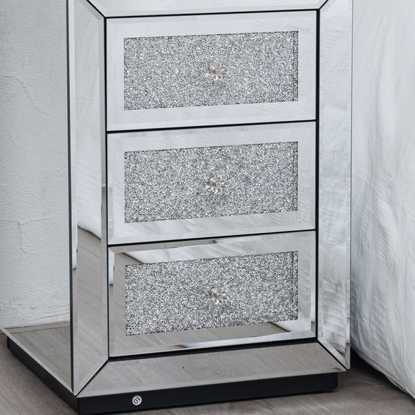 Elevate bedroom elegance with a dazzling reflective sidetable that brightens any space, complemented by three spacious drawers.