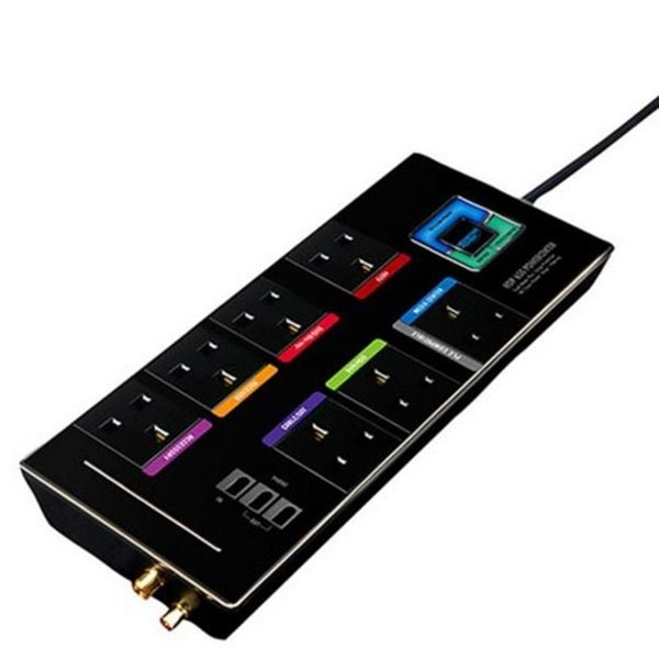 This surge protector features colour-coded sockets with matching cord labels for easy identification and a mountable design