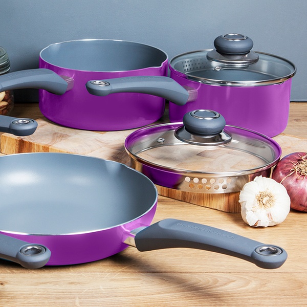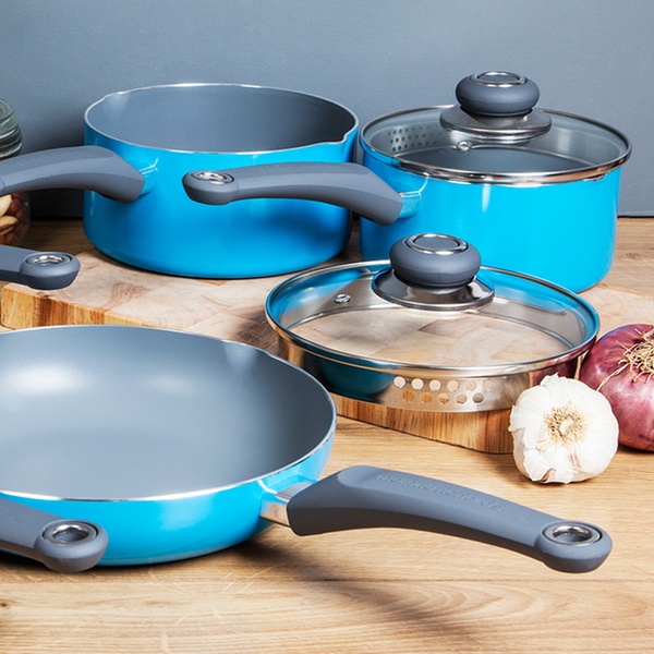 Featuring a deep aluminium body and induction base, this five-piece pan set makes a stylish addition to the kitchen utensils
