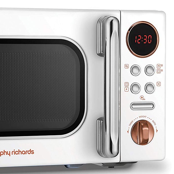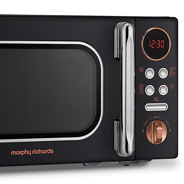 Featuring a rapid defrost function, these stylish microwaves from Morphy Richards have a practical child safety lock and five power levels