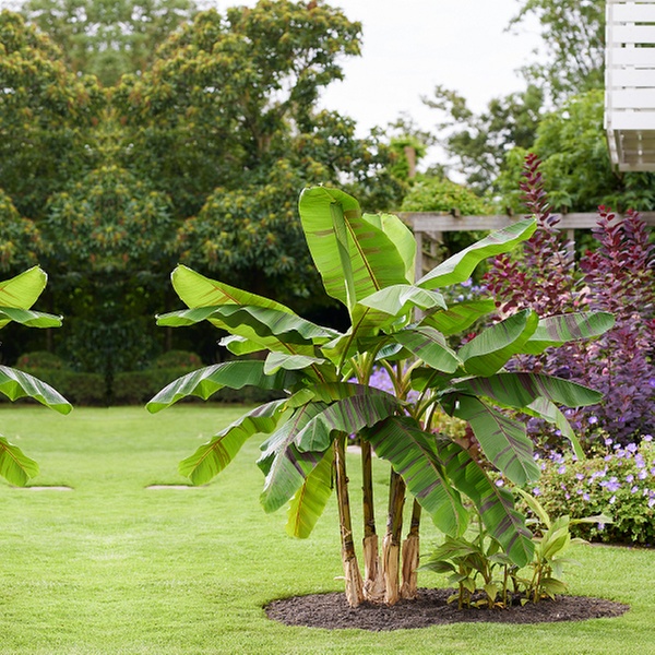 Striking maroon-red striped leaves add a tropical flair, making this hardy banana a standout feature in any garden setting