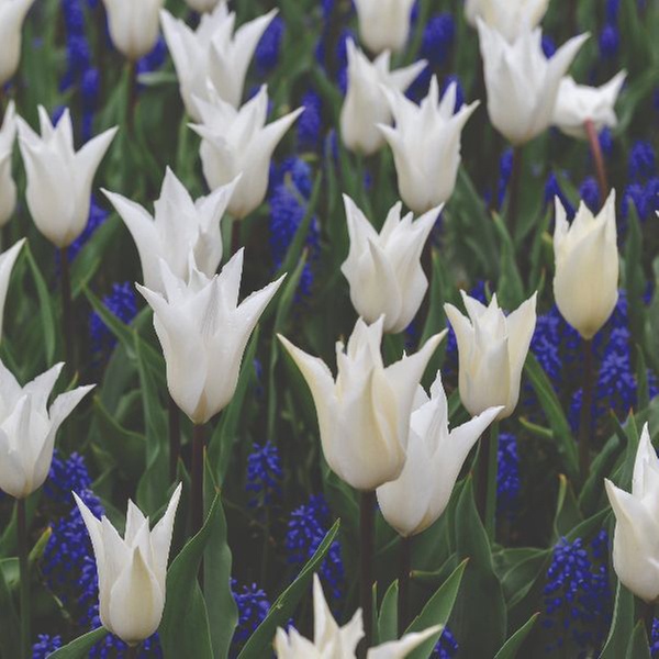 - Elegant contrast: tall, white pointed blooms of Tulip White Saporro rise above rich blue Muscari armeniacum