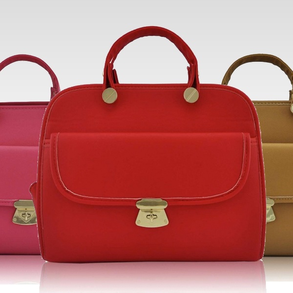 These bags feature a large front pocket plus zippered and open inside compartments; choice of eight colours including pink, oak, and red