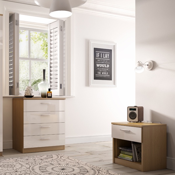 This three-piece set of contemporary high gloss bedroom furniture comes in a choice of six colour combinations to match most interiors