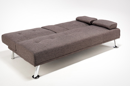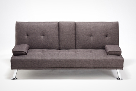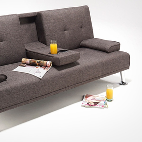 This soft fabric sofa bed is ideal for small spaces. It provides seating for three people and transforms into a bed which comfortably sleeps one adult or two children. It also features a handy pull-down table in the centre of the sofa with two cup holders for drinks when relaxing in front of the TV.