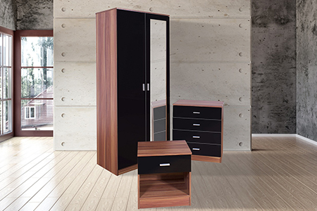 This bedroom furniture set is co-ordinated for contemporary slumber and available in a sleek black gloss and walnut finish. Each item comes with stainless steel handles and the wardrobes contain shelves and a hanging rail. The furniture will arrive flat-packed with delivery included.