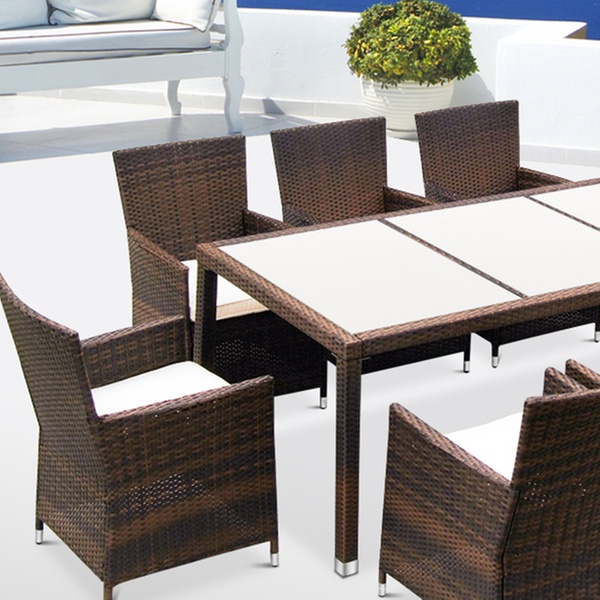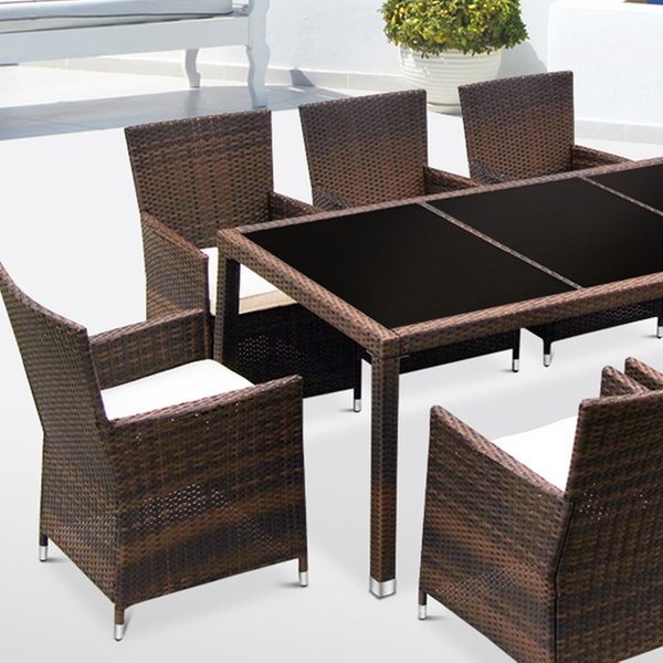 Today’s Groupon offers a nine-piece contemporary poly-rattan dining set in brown, grey or black with white or black glass for £379.99.