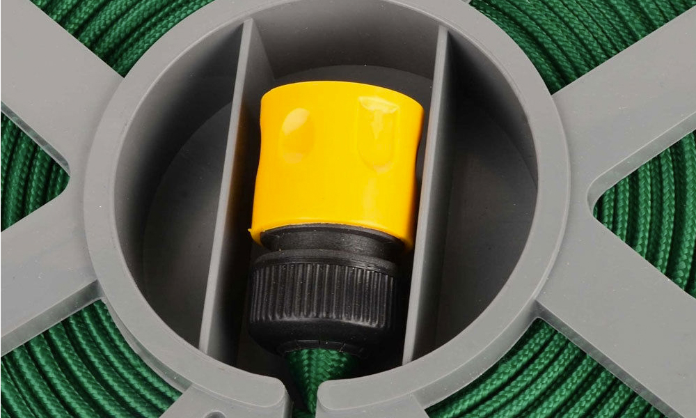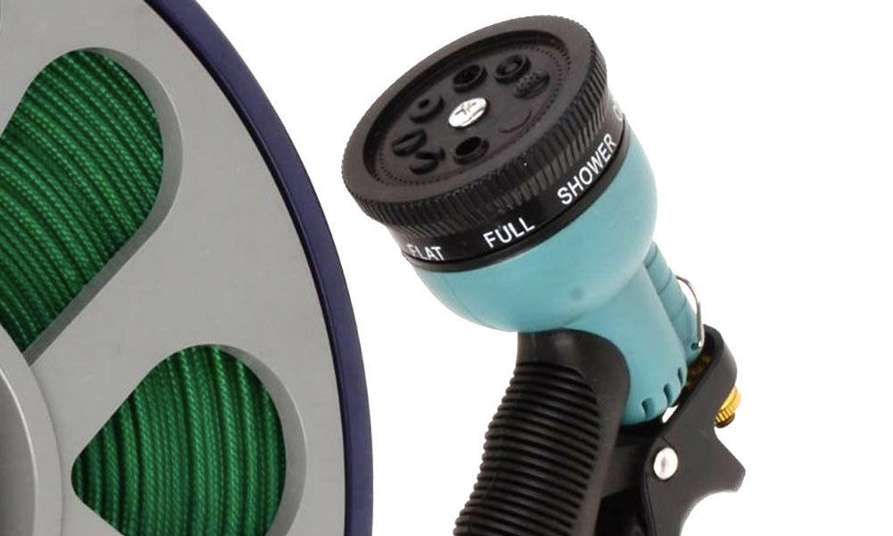 This hose pipe has a wind-up reel and spray gun with seven settings to help gardens look their best