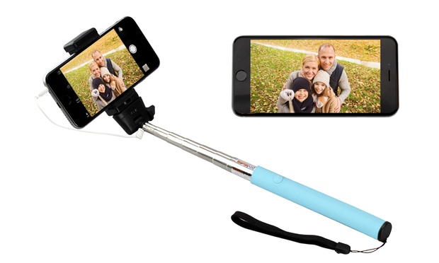 Choose from the following options for selfie stick with built-in handle clicker in black, white or blue:
