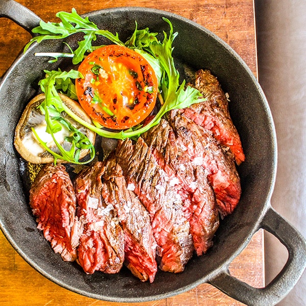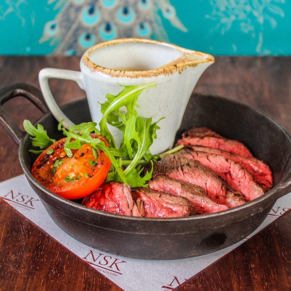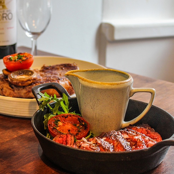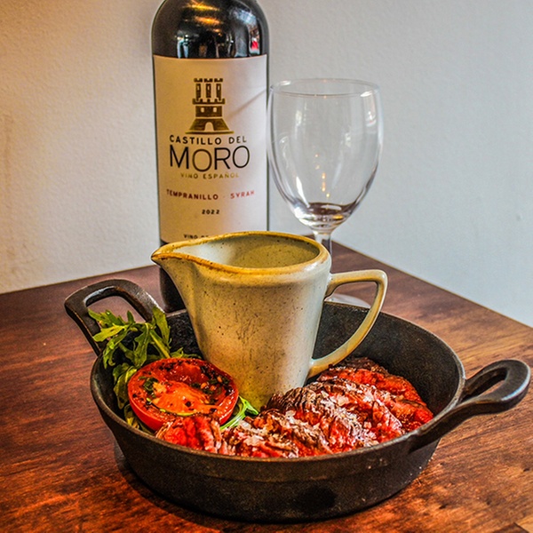 Indulge in our signature steak, perfectly cooked and paired with crispy fries and our house-made sauce.
