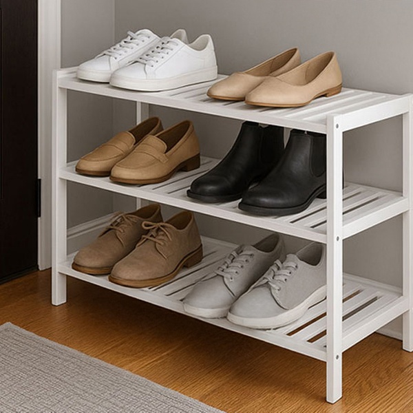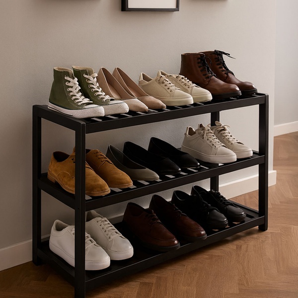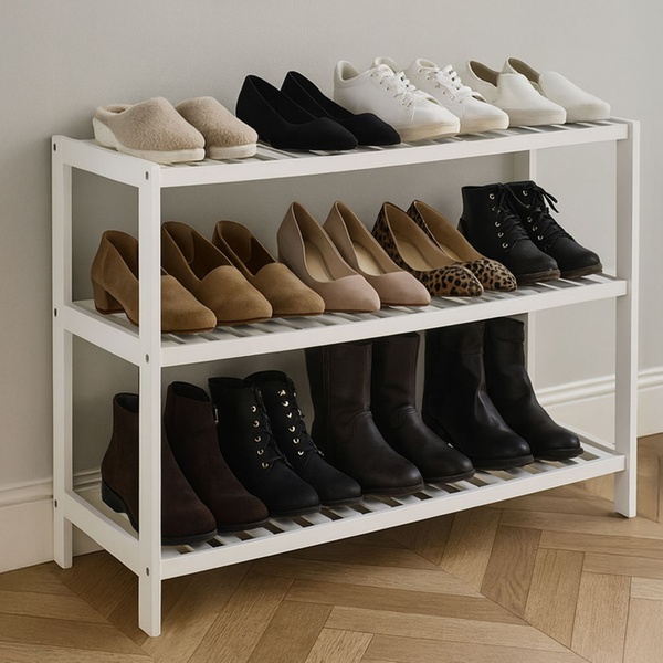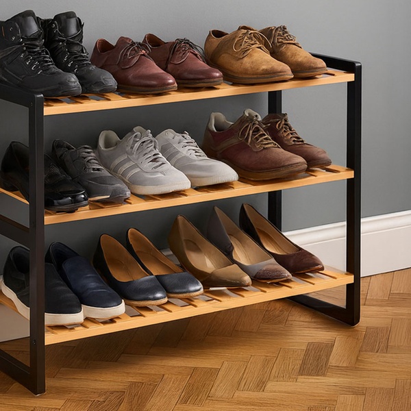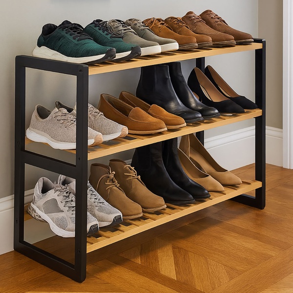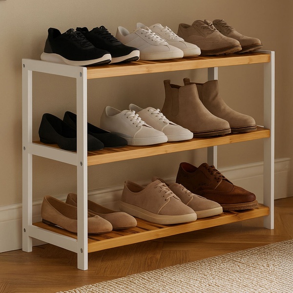 Crafted from 100% natural bamboo, this three-tier shoe rack combines durability with a sleek design for organized elegance in any room