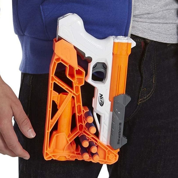 Stay on the move and ready for almost anything with this sharp fire blaster with removable stock and barrel extension for a more stable shot