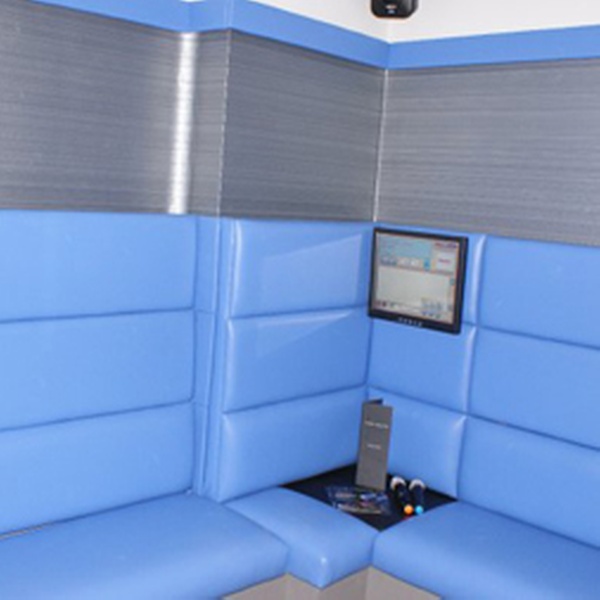 - Decorated room with colourful booths and a wig and hat box
